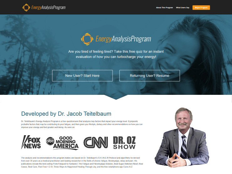 The Energy Analysis Program is a free online tool that analyzes key factors that impact your energy level. It pinpoints probable factors that may be contributing to your fatigue, and then gives you lifestyle, dietary and other recommendations on how you may improve your energy and feel greater well-being. The recommendations it makes are based on algorithms I derived from my 35 years as a medical practitioner and leading researcher in the fields of CFS, fibromyalgia, sleep and pain. It takes about 15-20 minutes to complete. When you complete it, you'll be provided a detailed analysis of your overall health and energy needs, along with specific recommendations on where you can improve!